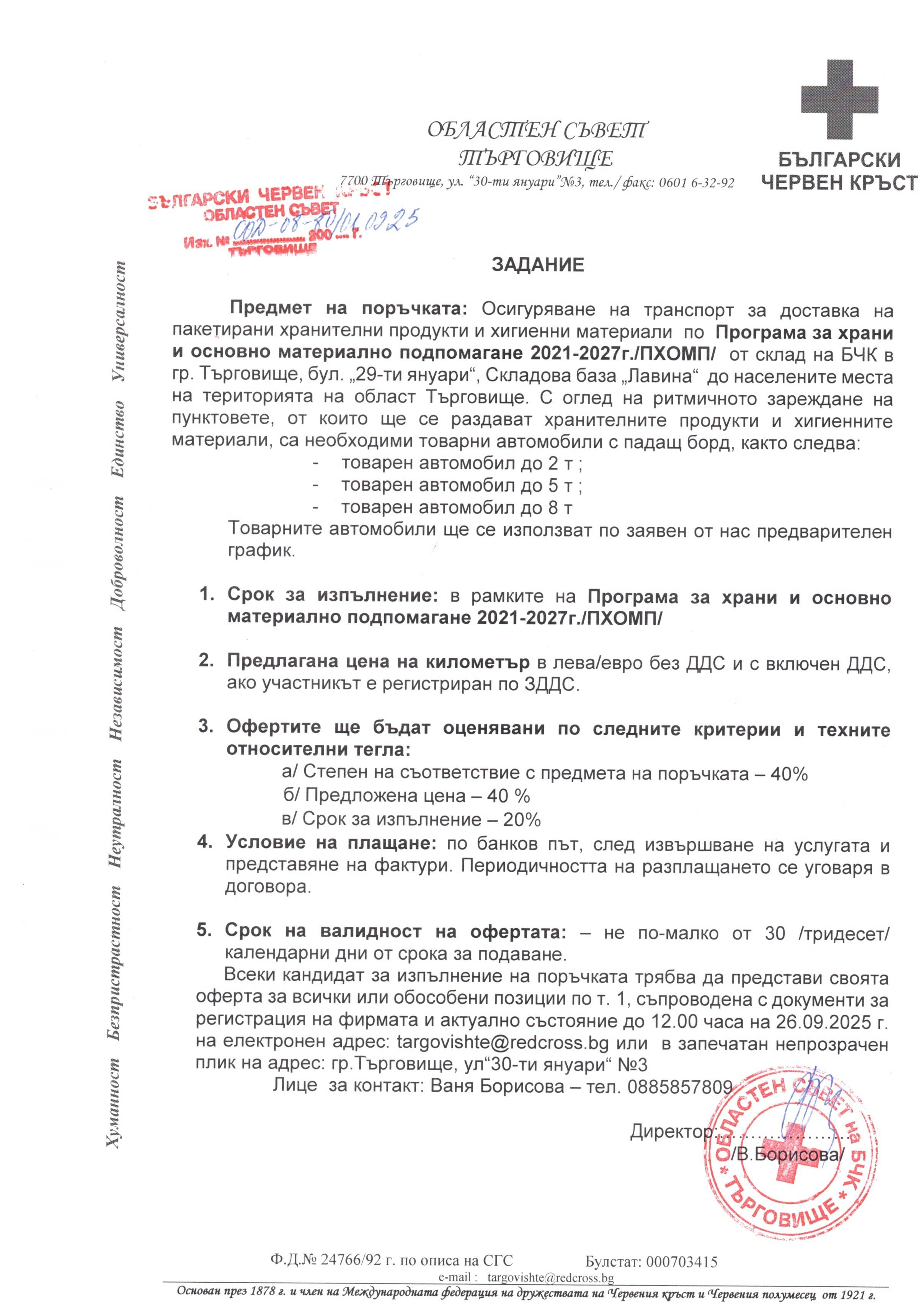 Всеки кандидат за изпълнение на поръчката трябва да представи своята оферта за всички или обособени позиции по т. 1, съпроводена с документи за регистрация на фирмата и актуално състояние до 12.00 часа на 26.09.2025 г. на електронен адрес: targovishte@redcross.bg или в запечатан непрозрачен плик на адрес: гр.Търговище, ул“30-ти януари“ №3