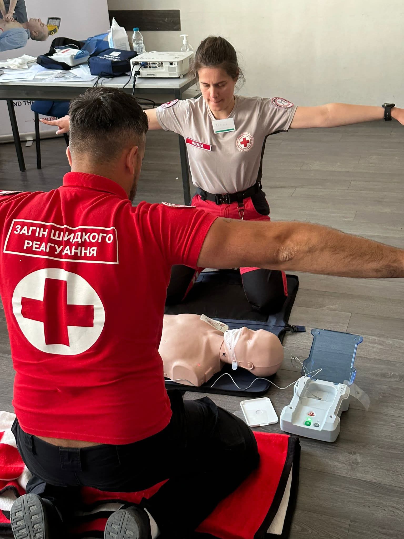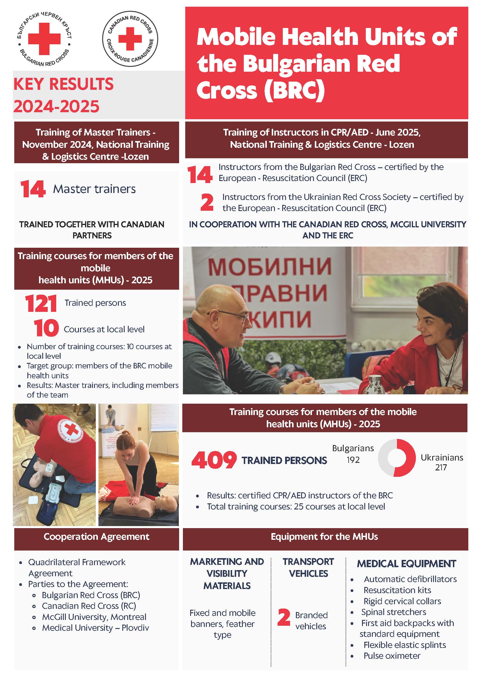 През м. ноември 2024 г, съвместно с Канадски ЧК бяха разработени модули и програма, за обучение на главните обучители (Master trainers), определени от областните/столичната организации и НЕРБАК. През м. юни 2025 г. бе проведен курс за сертифициране на 14 инструктори, от структурите на БЧК и НЕРБАК и двама от Украински ЧК по кардио-пулмонарна ресусцитация (КПР) и ползване на автоматичен дефибрилатор (AED). Обучението се проведе в НУЛЦ- Лозен, съвместно с експерти от КЧК, Университет Макгил, Монреал, Канада и Европейския център по ресусцитация (ERC). След обучението бе проведен и курс за служители и доброволци от Секретариатите на НС на БЧК и областните /столичната организации на БЧК и НЕРБАК по КПР и ползване на дефибрилатор. (Общ брой преминали обучение - 114 души). НУЛЦ - Лозен бе сертифициран от Европейския център по ресусцитация, като база за провеждане на регионални обучения. До края на м. ноември 2025 г. , на местно ниво бяха проведени 10 курса за обучение на членовете на МЗЕ, с участието на главните обучители (Master trainers) и представители на екипа по стандартна програма. (Общ брой преминали обучение - 121 души). Сертифицираните инструктори на БЧК по КПР/AED, проведоха 25 обучения по места, по отделен проект с МФЧК/ЧП.(Общ брой преминали обучение 409 души (217 украинци и 192 българи). През м. ноември се проведе курс по кризисни комуникации с 28 представители от областните/столичната организация на БЧК и НЕРБАК, с гост-лектори от Канадски ЧК и от клъстъра МФЧК/ЧП, Сараево. Към настоящият момент е предоставена част от одобреното (от партньора) оборудване за МЗЕ. БЧК съдейства за развитието на академични партньорства, в процес на подписване е четиристранен, рамков договор за сътрудничество между БЧК- КЧК - Университет Макгил, Монреал и Медицински университет – гр. Пловдив.
