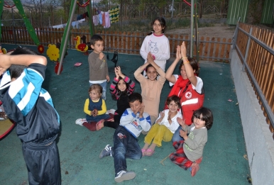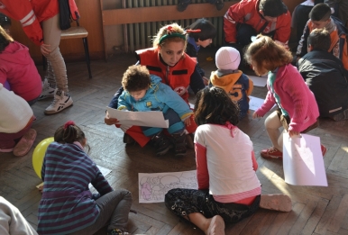 Доброволци играят с деца бежанци